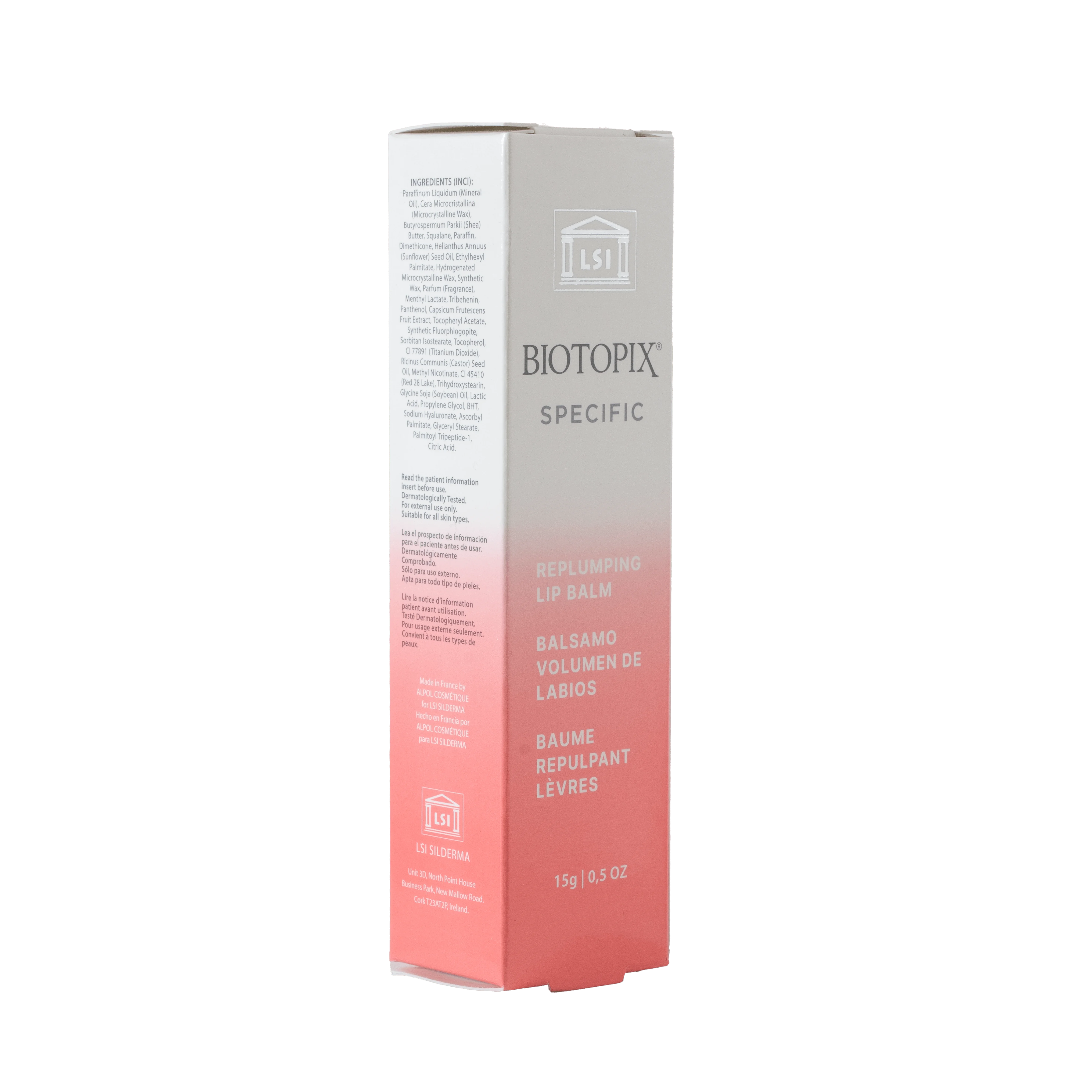 Biotopix Specific Replumping Lip Balm is a lip cream designed to plump, firm, and anti-age the upper lip. It contains a high concentration of collagen III accelerating vectors and a patented vegetal extract for an intense lifting effect. It also contains Hyaluronic Filling Spheres for immediate swelling and viscoelastic properties to prevent skin ruptures. The product also increases collagen production by fibroblasts and retains water and electrolytes essential for skin cell life. Capsaicin, an extract of chili pepper, provides a burning sensation for a plumped-up look.