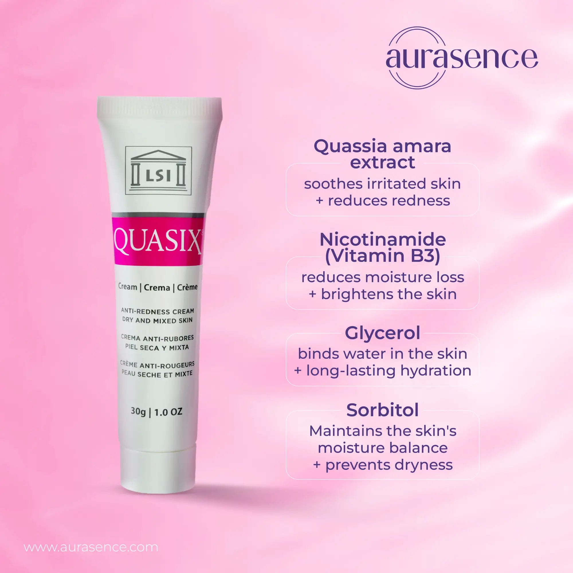 Formulated specifically for dry and combination skin, QUASIX Cream provides intense hydration while simultaneously combating redness and other skin imperfections. Its lightweight texture absorbs quickly into the skin, delivering instant relief and leaving behind a refreshed, revitalized complexion. It is a recommended skin care product for redness-prone skin.